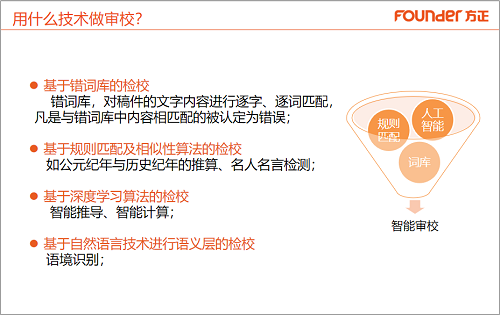 在书版行业有句话行话,叫做“无错不成书”。“可以说,图书审校已经成为图书出版的行业痛点,编辑需要一个得力的‘机器校稿助手',识别并纠正字词错误、格式错误、知识错误等基础错误,让编辑把宝贵的时间和精力聚焦在学术水平、知识、可读性等高级问题上。”高国连说。 实际上,方正电子早就将人工智能技术纳入研发范畴。目前,方正智能辅助审校能够帮助编辑进行逻辑性校对、知识性校对、版式校对等。 “审校的技术基础包括四方面内容:基于错词库的检校、基于规则匹配及相似性算法的检校、基于深度学习算法的检校、基于自然语言技术进行语义层的检校。”高国连说。以这4类技术为基础,使得智能审校能够“一眼识别”十几种基础错误,包括:字词错误、章节序号、图表公式序号、名词术语不规范、历史纪年检查、敏感词检查、古今地名检查、中外译名检查、语义重复、全半角不一致等。