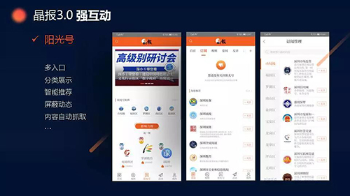 例如,晶报APP3.0与晶报政务融媒体运营的多家“阳光号”互通互联,在3.0版本中,多入口、分类展示、智能推荐、自动抓取“阳光号”的精彩内容,APP中还设置了排行榜单,可对“阳光号”进行打榜。