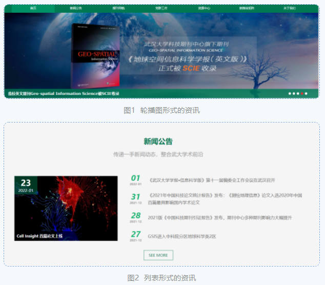 资讯模块能够支持刊群自动同步指定网站的资讯信息,整合到刊群页面进行发布,资讯发布形式有轮播图或文字列表可供使用。运营人员可以在刊群后台根据网站展示需要修改已同步的资讯进行再次发布,灵活满足宣传需要。