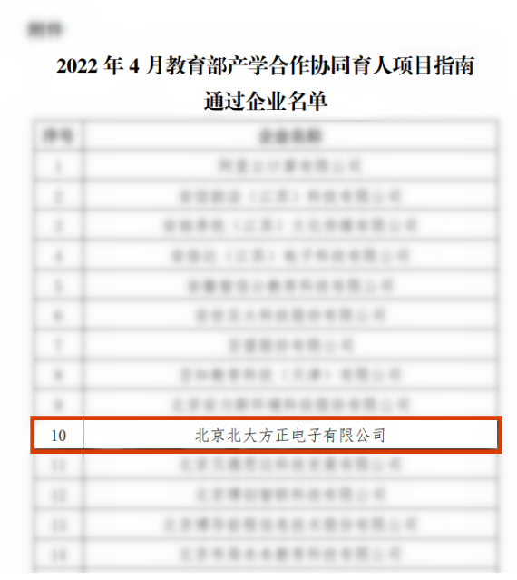 2022年,方正电子积极响应《教育部高等教育司关于征集2022年产学合作协同育人项目的函》,发挥主体作用并成功入选(点击链接:《重要通知 | 2022年方正电子教育部产学合作协同育人项目申报正式启动!》了解更多目前,已与多所重点高校在新文科建设、创新创业教育改革、教学内容和课程体系改革、师资培训、实践条件和实践教学基地建设方面建立项目合作,将会有更多高质量成果产出。